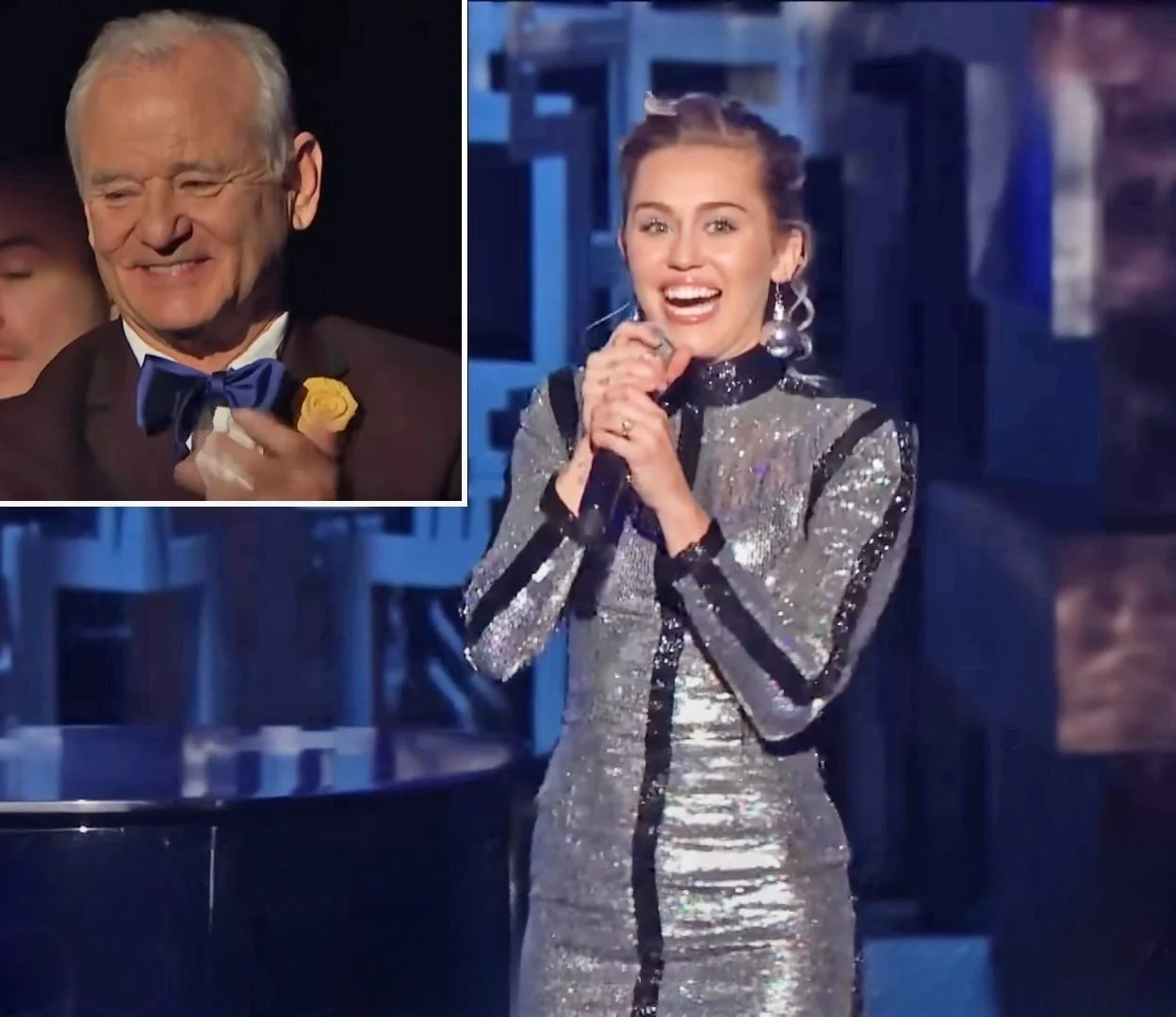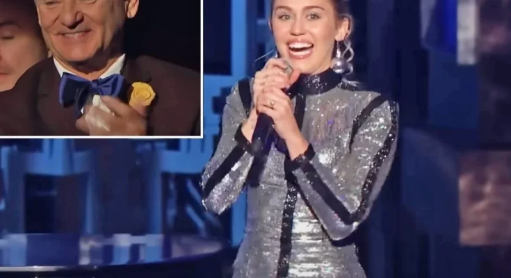 Like Sinatra’s 1969 classic, Miley’s version opens with a grand piano as the background, a waltz-like tempo embellished with pop icon vocal runs, and clever asides interspersed between words. Bill Murray, who was seated in the audience, gave Miley a standing ovation as she ascended the stage and watched her first verse with tears in his eyes.